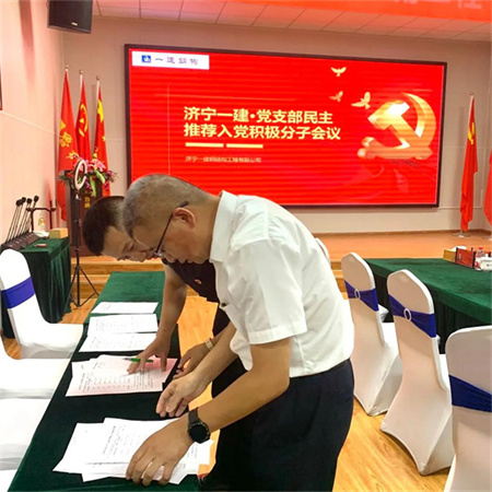 會議開始,王總介紹了濟寧一建鋼結構工程有限公司黨員發展的基本程序,黨員發展的基本條件,堅持黨員發展個人自愿、個別吸收的原則,成熟一個發展一個。然后王總對本期入黨積極分子的思想、工作情況做出介紹。王總要求參與投票的黨員、群眾本著公平、公正、公開的原則對本期入黨積極分子進行投票。